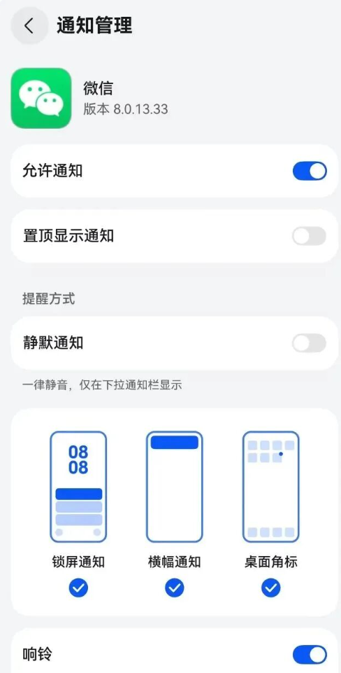 升级到HarmonyOS 6.0.0.115后,可以在系统通知管理中更换微信铃声,终于能设置专属提示音了。