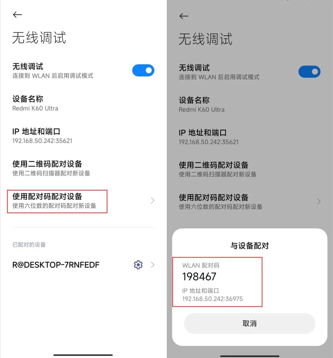 在无线调试页面,你会看到: