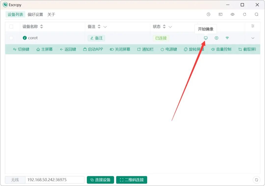 - 打开 Escrcpy,点击开始镜像