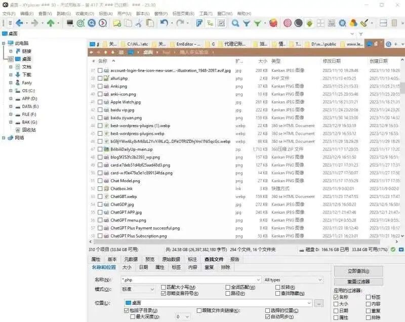 XYplorer 还提供了强大的文件筛选工具并支持用户自行设定的文件类型(单种或多种拓展名),可以筛选并显示某一或数个类型的所有文件以方便进行批量操作。