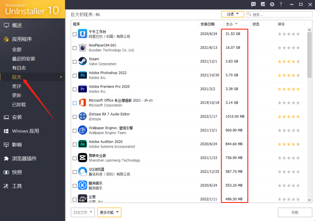 卸载软件是为了清除无用的程序,解放磁盘空间。阿香婆菜单栏里有一个“巨大”的选项,可以根据每个应用程序磁盘的大小进行排序。什么软件占用空间大,一目了然!