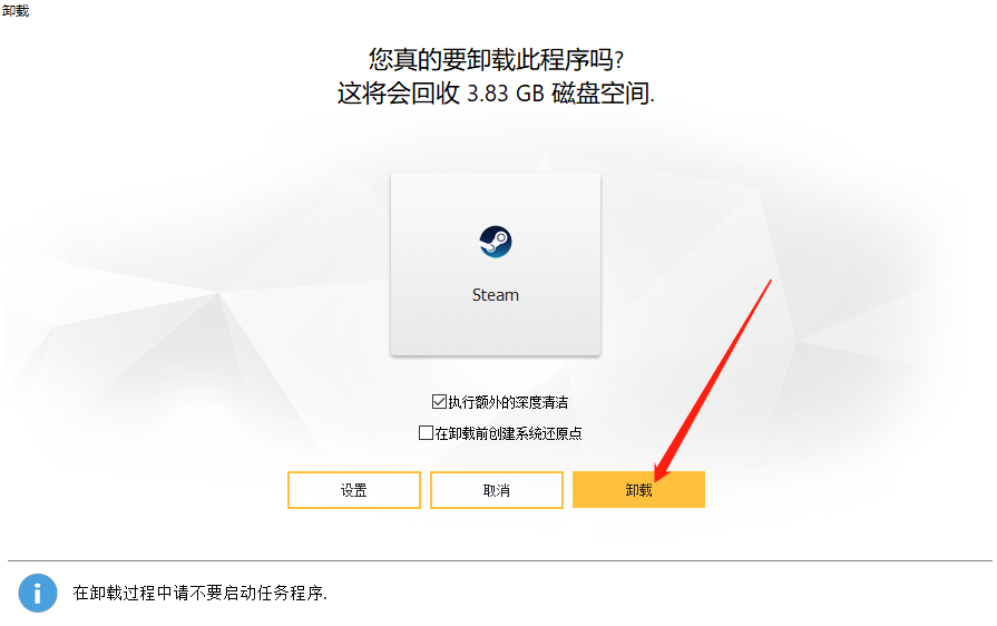 这个深度卸载到底有多深度?举个例子,就拿Steam来说,选中它开始卸载,阿香婆会执行两个动作: