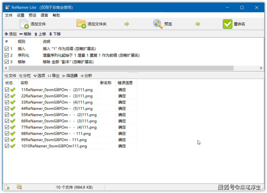 把要改名的文件夹拖进去,就可以看到了文件列表了,添加规则,点击重命名就可以完成了。比如下面简单设置几个规则,插入后缀、序列化、删除关键词等都可以很开完成。