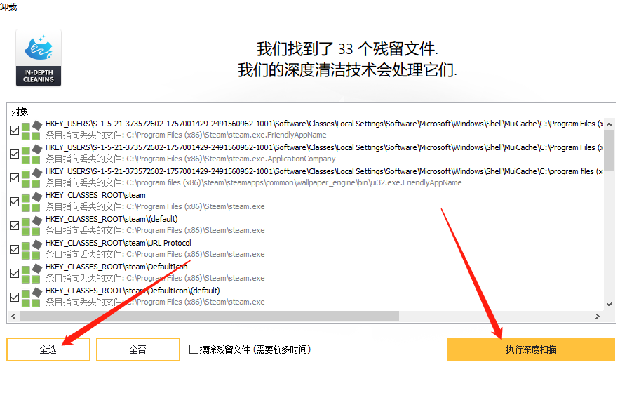 然后对注册表和剩余文件进行深度扫描,并勾选上执行深度清理。直到此时,一个软件才算是彻底卸载完毕。