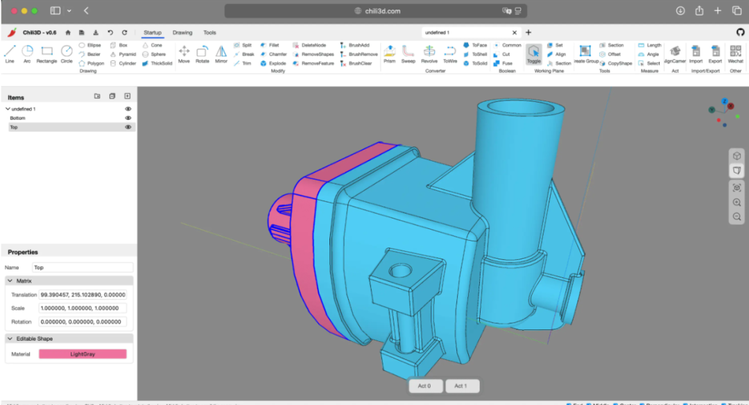 Chili3D 打破了传统 3D CAD 软件需要下载安装的限制,将建模工作搬到了浏览器中。这个开源平台基于 TypeScript 构建,巧妙地结合了 WebAssembly 和 Three.js 技术,为用户提供了流畅的三维可视化体验。无论是创建基础几何体(立方体、球体、圆柱等),还是绘制二维图形(直线、弧线、圆等),甚至进行高级的布尔运算、拉伸、旋转、倒角等操作,都能在这个平台上轻松完成。