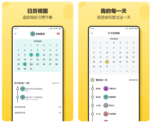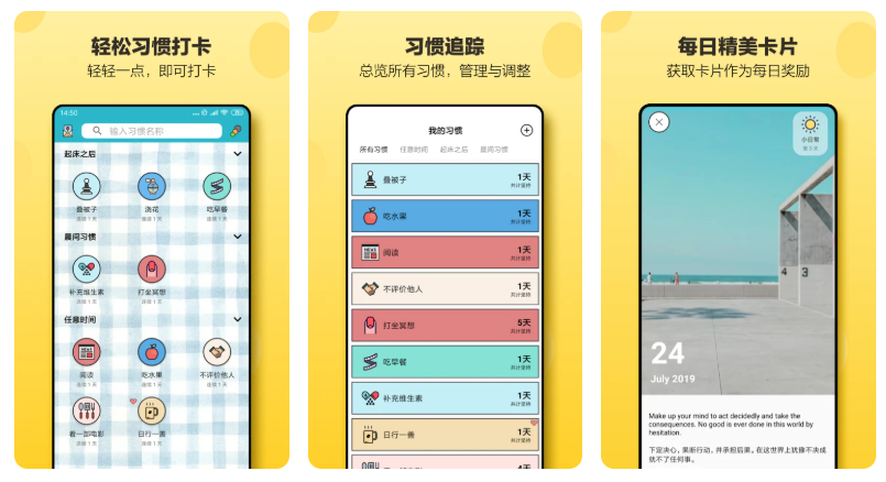 不仅可以作为习惯追踪工具,也能作为一天的小日记使用,记录了自己每天完成了什么,对自己的每日完成事项进行打卡,只需要点击图片上的小图标即表示完成该习惯的打卡,非常的方便。