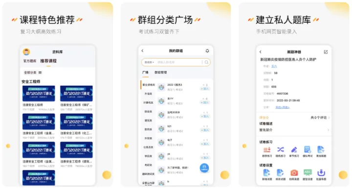 这个软件提供了一站式学习备考解决方案,涵盖建造师、自考、医学、会计、经济师、成人考试、金融等职业考证服务,多个种类的题库和课程相结合,还有课程特色推荐,帮你建立私人题库。
