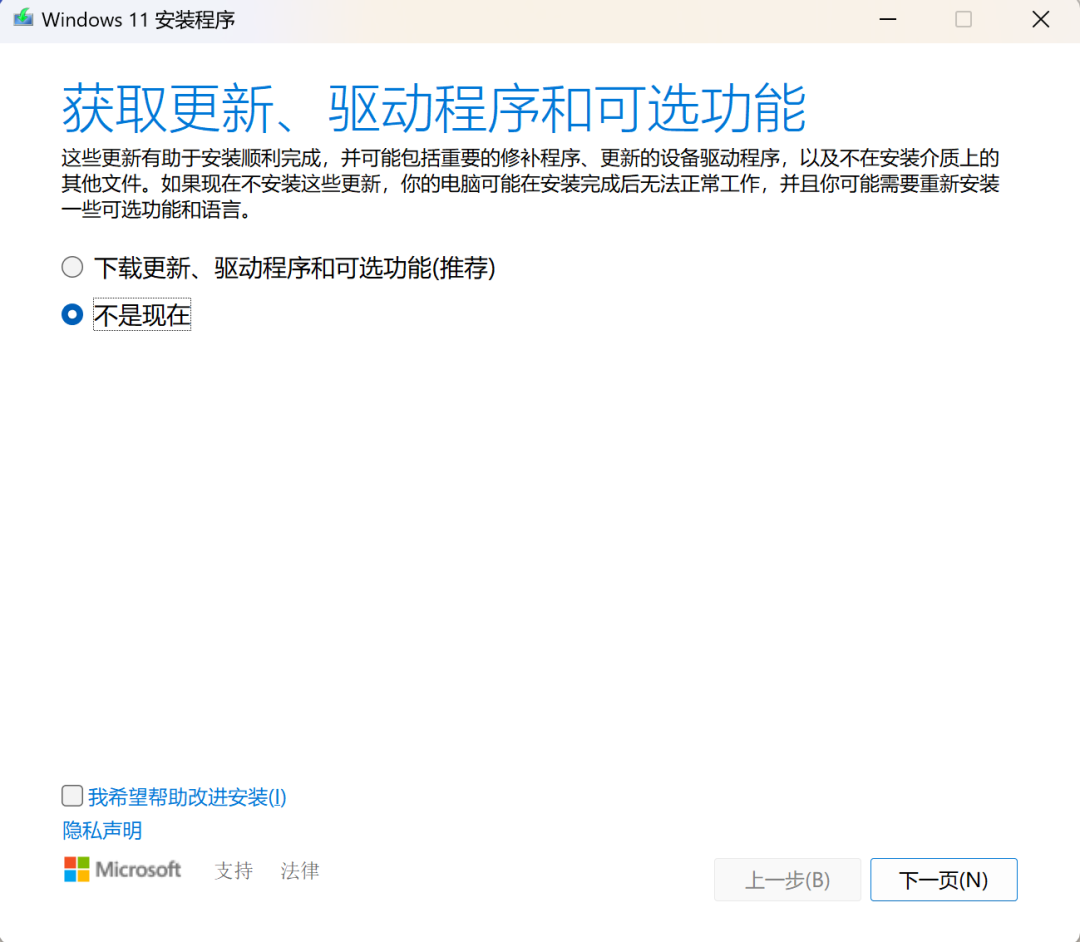在弹出的选项中,选择"不是现在",然后点击"下一步"。这样可以加快安装速度,系统更新可以在安装完成后再进行。