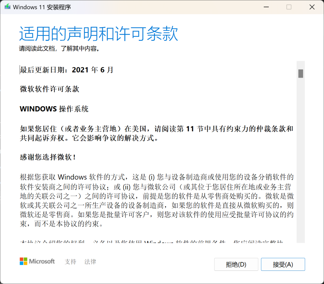 系统会开始进行兼容性检测。检测完成后会显示许可条款界面,阅读后点击"接受"。