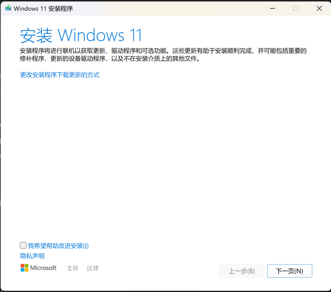 很快会弹出 Windows 11 安装界面。在第一个界面中,点击"更改安装程序下载更新的方式"。