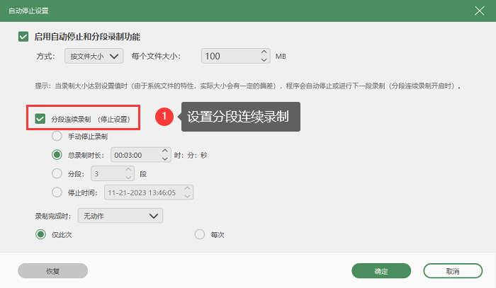 步骤3:此外,软件还可以进行分段连续录制,点击自动停止功能,设置总录制时长,确定需要分段录制的次数。
