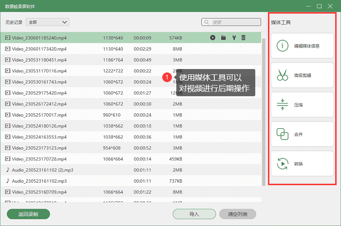 完成录屏后,如果您想更好地储存和分享录屏工具,或者想要对对视频的格式进行转换,可以进入软件【录制历史】页面,使用相应的【媒体工具】,对文件进行后期处理。