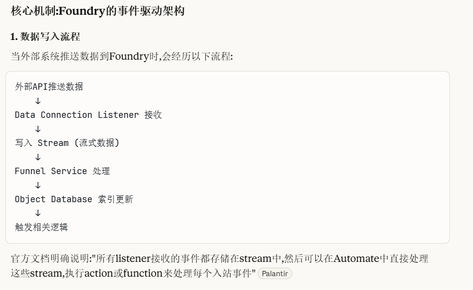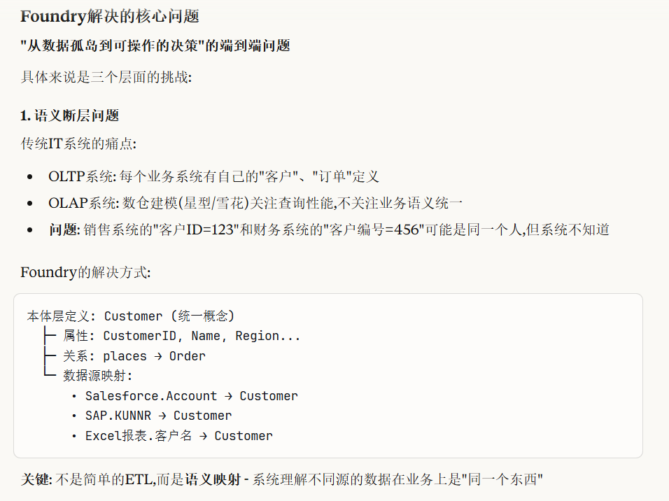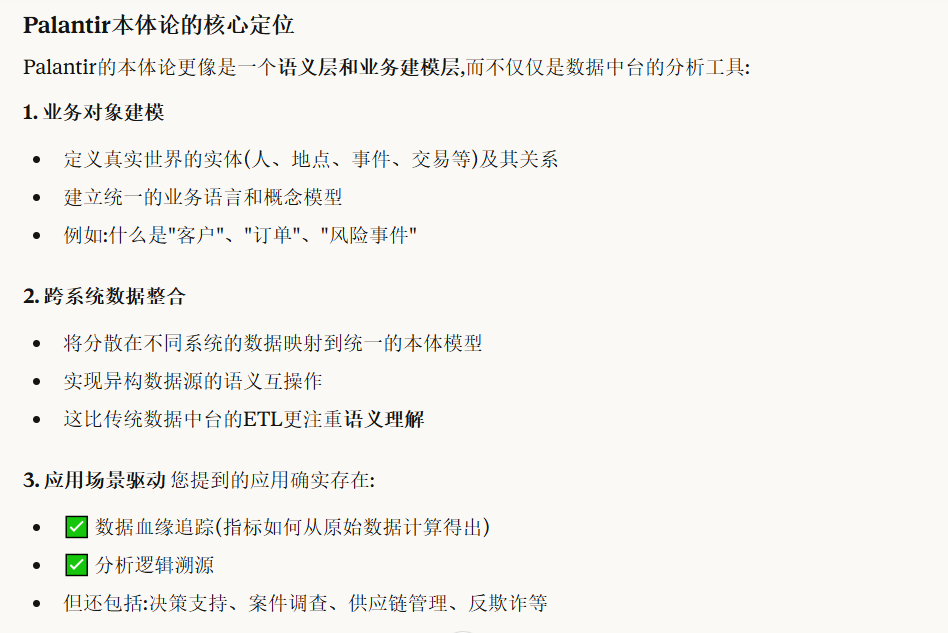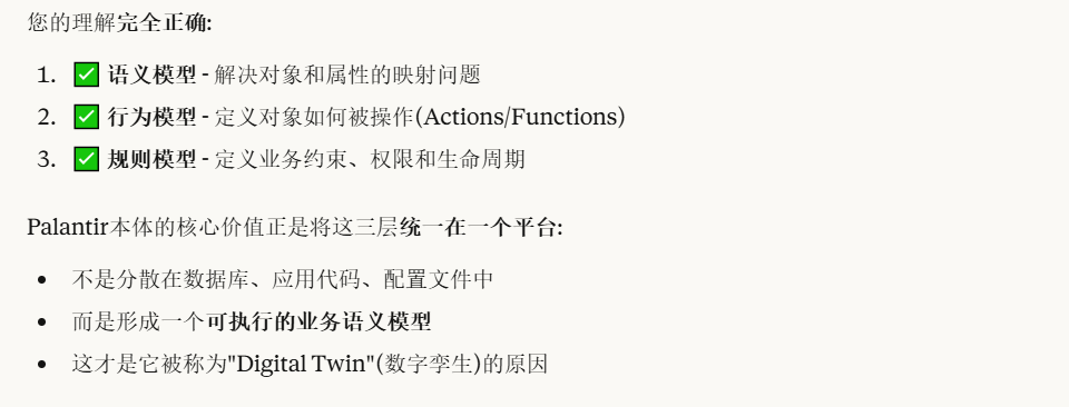 就是对于Palantir出来的这个本体,我刚才已经强调了,它不叫无中生有,它是在已有业务系统、已有分析内容的系统基础之上,构建了这么一个连接桥梁,实现了对象、数据、行为、规则、语义的一个融合。