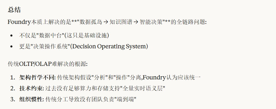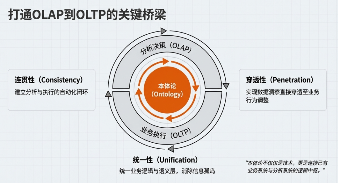 本体论通过这个建模,核心它要起的作用就是:打通OLAP到OLTP的这个路线,实现数据分析到后续的数据业务执行行为之间的一个关键的穿透。这个原来是传统情况下面根本没办法做到的。