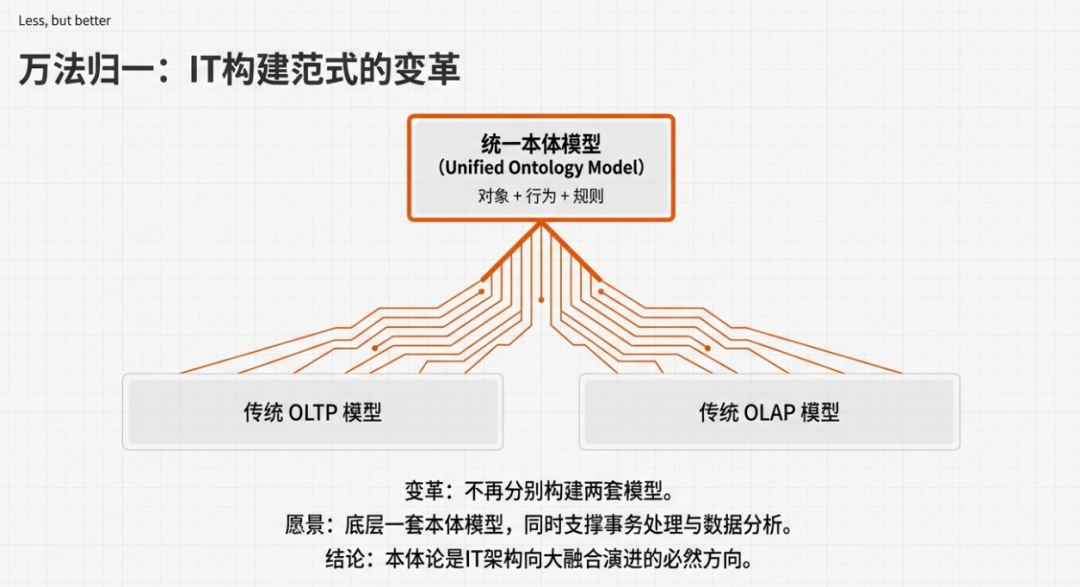 但是我思考的一个重点是什么呢?就是本体论的思想会不会带来我们传统IT构建范式的一个大变革?我能不能在传统IT构建的时候,就完整的应用本体论的思想,实现业务对象、数据、行为、规则的大融合?那如果我一开始就应用的本体论的思想,那我这个时候的模型就不会分OLTP和OLAP都各自构建一套模型,而是构建一套融合的本体模型。