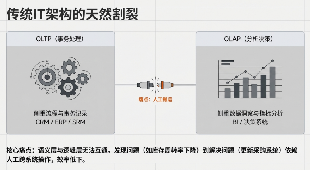 举一个简单的例子:当我在数据分析类的系统发现了一个数据指标出现问题以后,比如说我的库存周转率下降得很厉害,那么我去分析这个指标究竟是哪里出了问题,我全需要人工去执行。包括分析出来问题以后,我可能还要手工地回到我的采购系统、库存系统去更新相关的数据或者是状态。也就是说,我原来的OLTP和OLAP天然是割裂的。