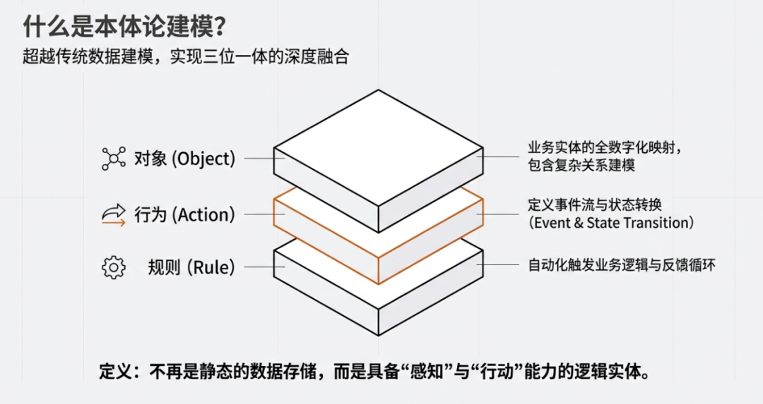 本体论的建模它就不是单纯的传统的数据建模,而是一种对象、行为、规则的融合建模。在对象建模里面包括了对象的关系建模,在行为建模里面包括了事件和状态转换的建模。