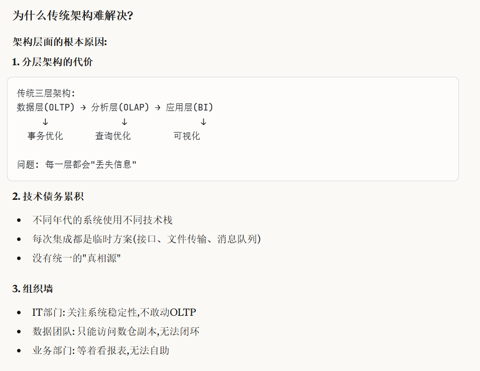 虽然说原来我们也在做这方面的努力,包括比如说TP/AP一体化工作,但是这个仅仅是数据层面的融合和统一,它没办法去解决业务逻辑层或者是叫语义层的融合统一。这个是传统IT系统建设天然存在的问题。你只有了解了这个问题,你才能够知道:我们为什么要去做本体模型?或者是通过本体论的思想解决什么问题?