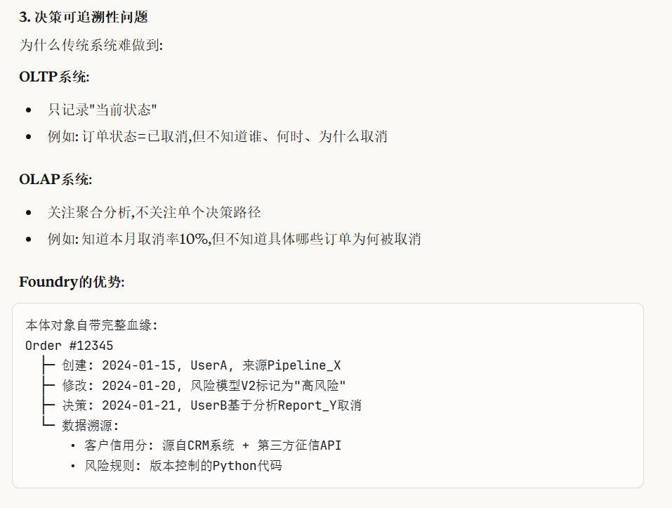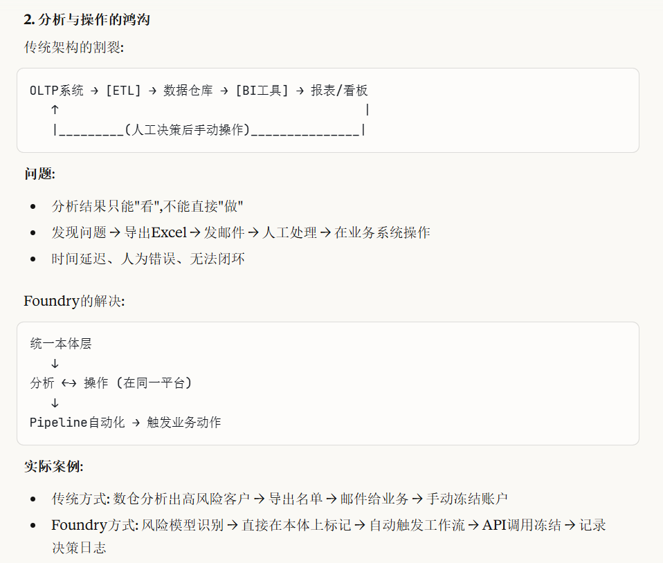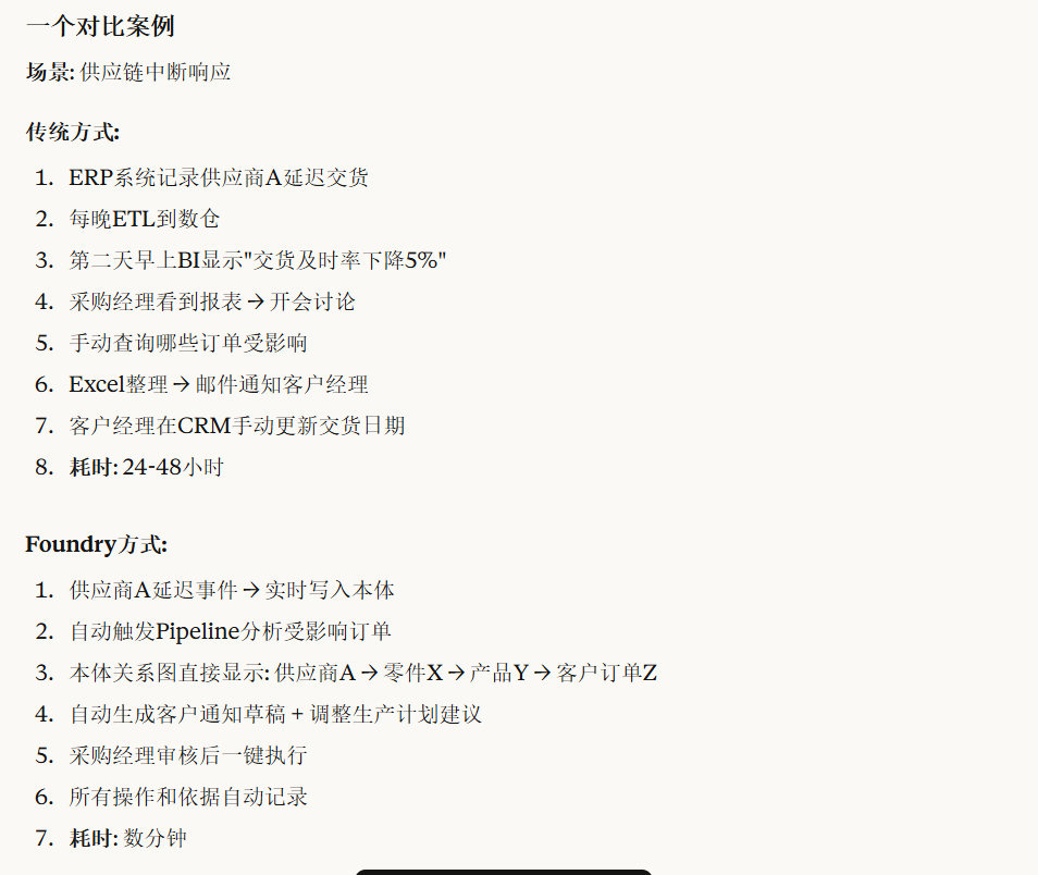 所以大家可以看到:通过这种方式,它就实现了从决策分析到实际的业务执行的一个连贯动作。这个在我们传统的IT建设里面是没有的——打通数据分析到后续的数据行为状态调整这么一个自动化路线,在我们的原来的系统里面没有的。这个是本体论带来的巨大的一个价值。