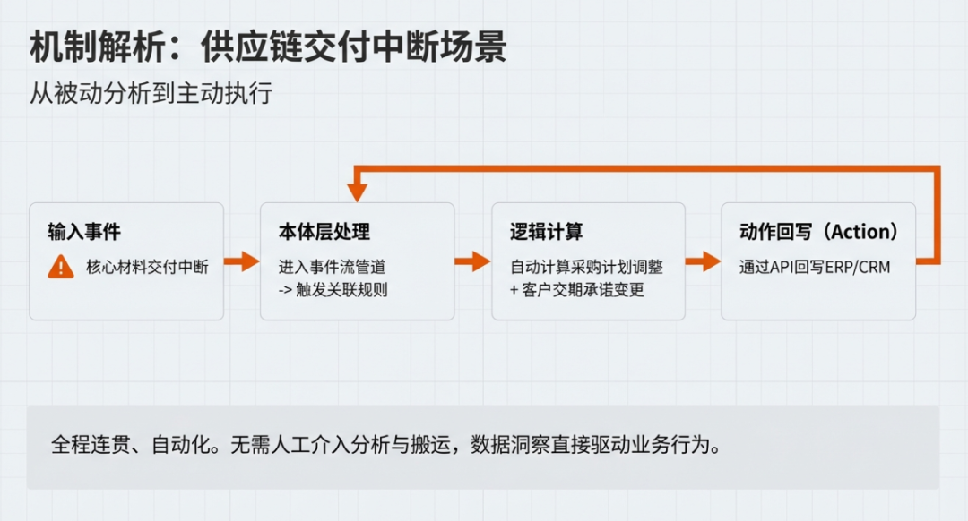 但是到了本体论阶段,它实现一个关键的东西是什么呢?由于它有完整的对象、行为、规则建模,当某一个核心材料供应链中断以后,它就是一个关键的事件。这个事件就会进入到事件流管道,再进入事件流管道以后就会去触发相关的规则。如下是核心机制的描述: