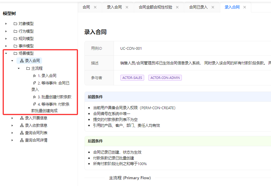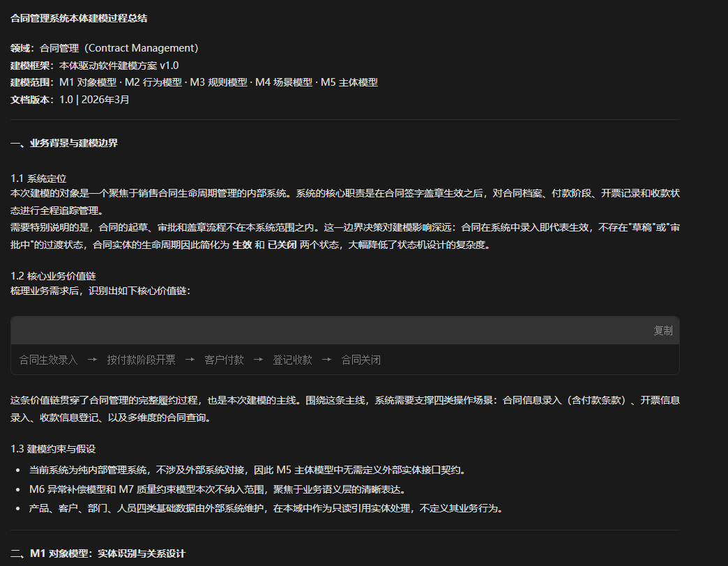 当然我拿到建模规范以后,因为我原来本来就写有一个详细的合同管理的需求。我刚好就用合同管理这个需求,对我整个建模规范做了进一步的验证,所以说 AI 它又会基于合同管理的需求,给出了一个合同管理系统本建模过程的总结。包括具体的业务背景,建模的边界。核心的业务价值链,包括整个的行为的识别事件链的设计对象的建模行为的建模,规则的建模,所有的内容它都会有一个完整的总结。