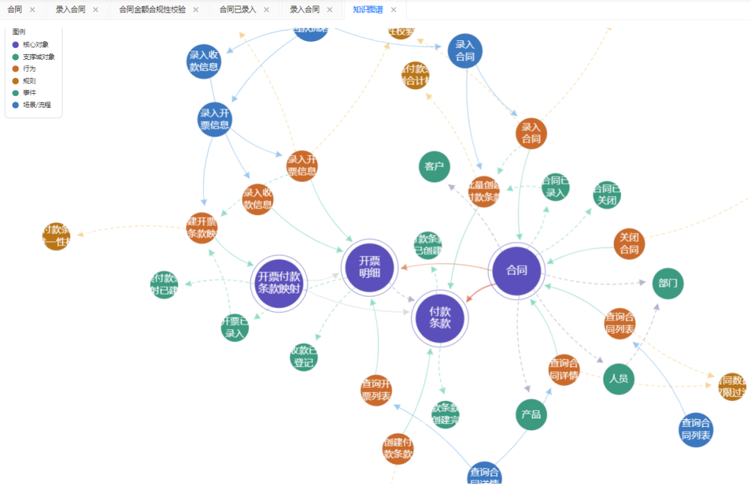 最终形成一个完整的,基于合同录入场景的这么一个本体论的图谱。所以大家从这个图可以看到我实际的场景对象行为规则,它是高度融合的,它是形成一个完完整整的一个知识网络的图谱。