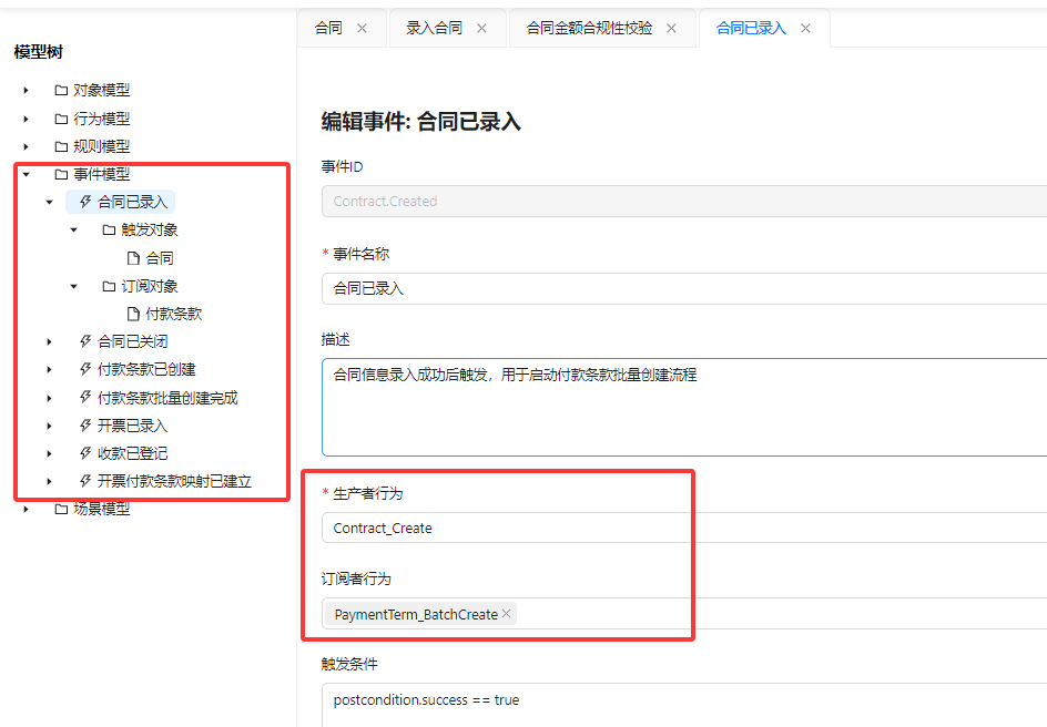 类似于合同已录入,我们就可以看得到它的触发对象是合同,它的订阅对象是付款条款这个对象。这样的话通过事件就很好的将各个对象本体之间完整的连接起来了,而且通过事件实现了关键的一些消息的回写。