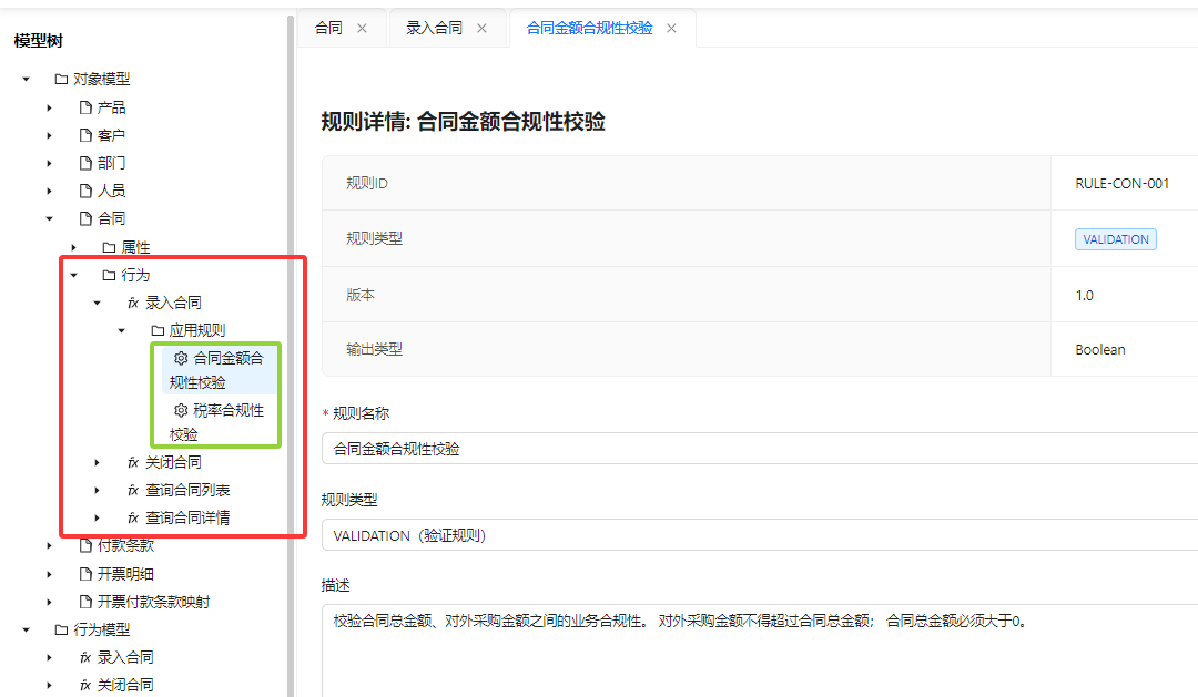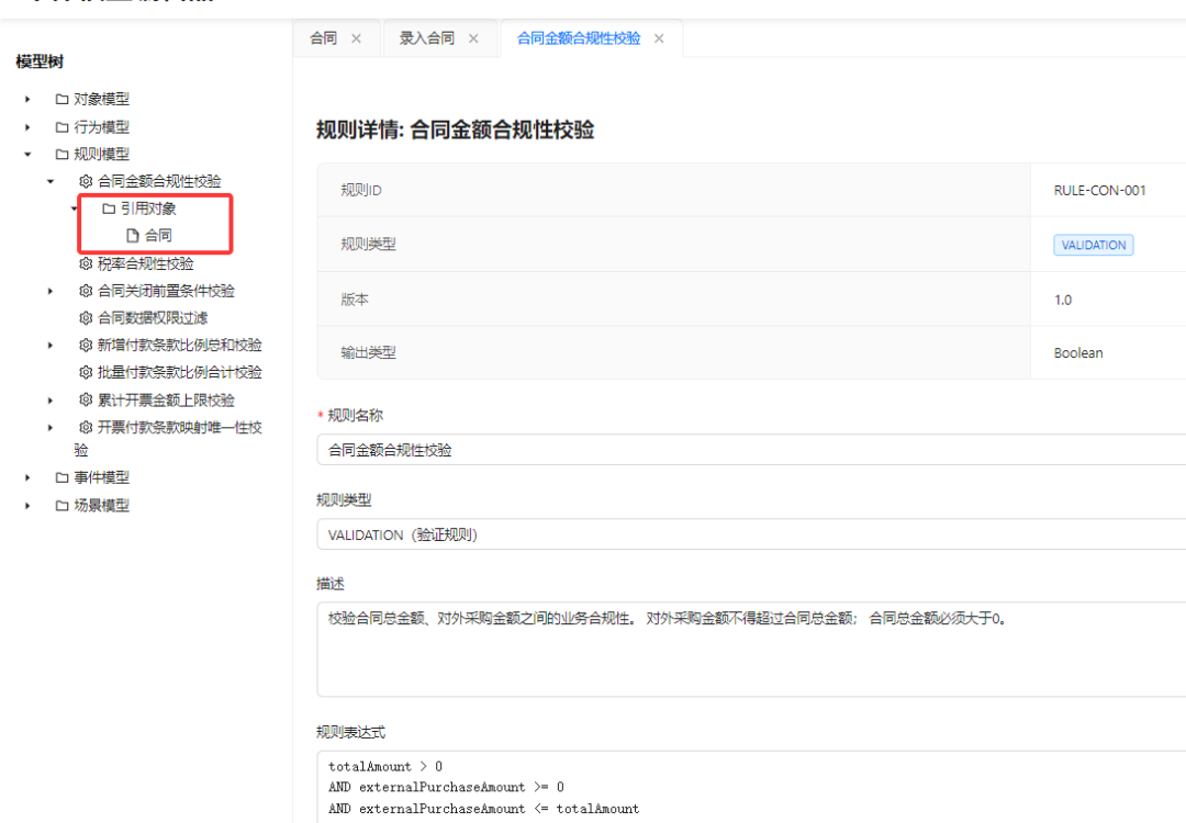 只是我在这个地方做了一些增加,因为每个行为它还可能调用到相关的一些规则。在行为下面我们可以看得到它究竟引用了哪一些参考完整性规则。比如说合同的录入,它其实引用了两个规则,一个是合同金额合规性校验规则,一个是税率合规性校验规则。