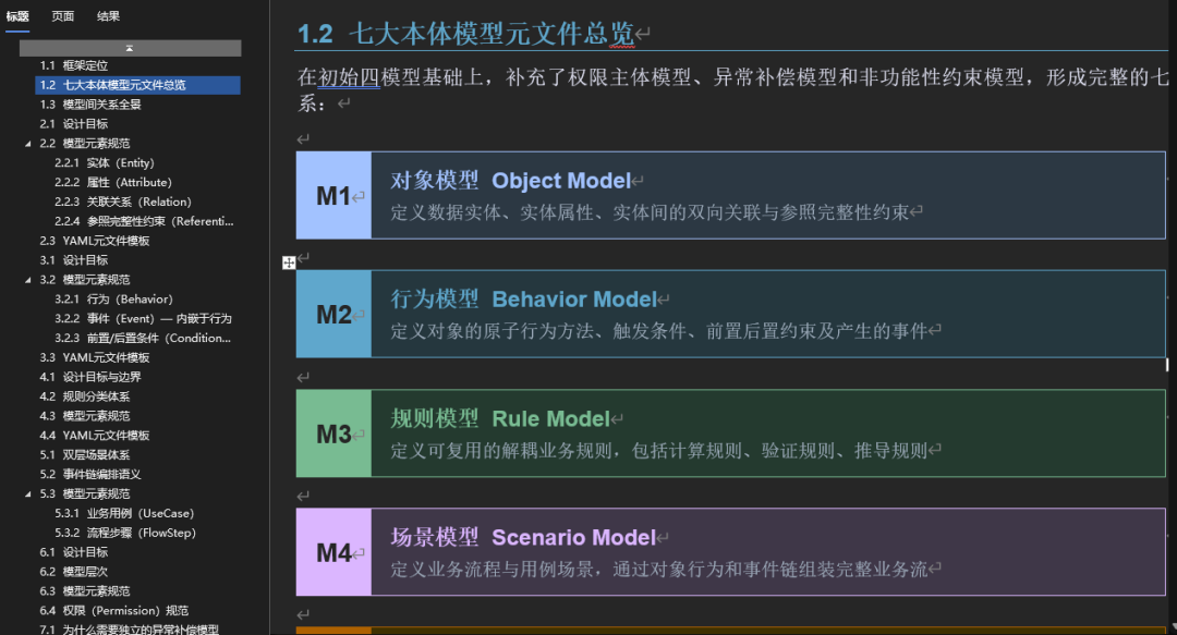 在第二次迭代的时候,通过和AI大模型的交互,整个本体模型进一步进行了扩充了,增加了主体模型,异常补偿模型等关键内容。而且AI在深刻理解我的意图后,帮我输出了一个完整的本体论建模规范,并给出了可以用Yaml文件来更加精确化的定义本体模型。