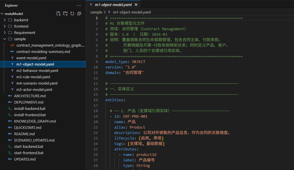通过这么一些模型源文件共同就构成了合同管理的本体。在这一步做完了以后,我接着我就在想我们能不能简单的通过VibeCoding做一个简单的本体模型的编辑器。