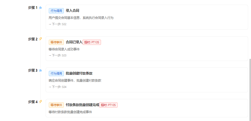 第一个录入合同,第二个等待事件,第三个批量创建付款条款。第四个等待事件。这样的通过行为规则相关的组合,我们就完成了一个完整的业务功能,包括业务功能更上层之间的流程。