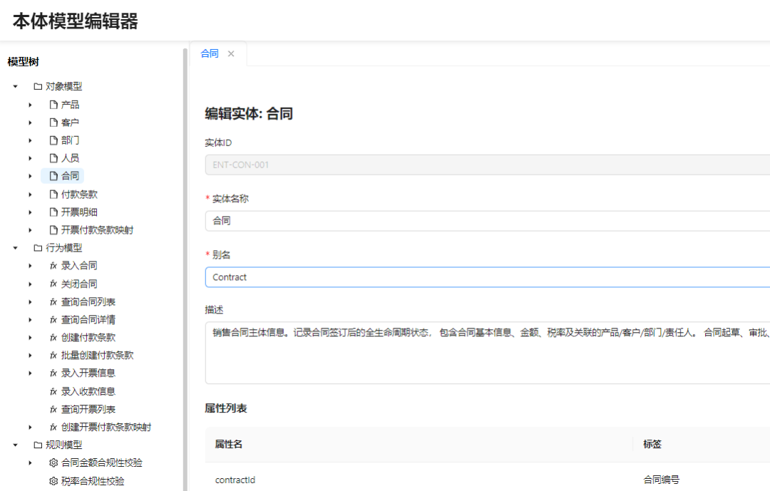 可以看到合同这个对象就有合同编号,名称,所产品,责任人,签订时间这些关键属性信息。具体的行为可以理解成传统的面向对象编程里面的方法,比如它会有录入合同的行为。关闭合同的行为。