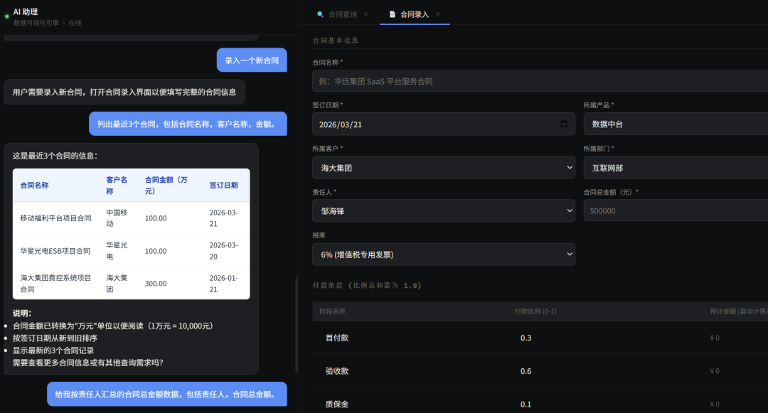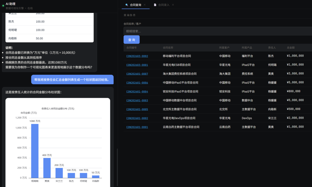 OPEN_TAB),在右侧工作区唤起完整的 ContractEntryForm React 表单。我们在架构中并没有预设死板的报表页面。所有的报表都是 Dynamic(动态的)。 依靠大模型强大的代码与逻辑理解能力,我们在前端集成了 ECharts(用于数据图表)和 Mermaid.js(用于流程逻辑图)。