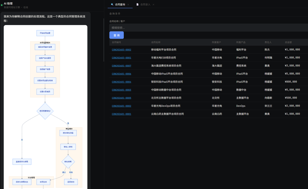 录完的合同你在这边还可以查询到合同相关的信息,包括合同明细的信息。这个是涉及到 UI 界面部分的内容,但是其他很多我们把它叫做自然语言对话,类似于我当前已经简单的集成了可视化的流程图,可视化的图表的展示。