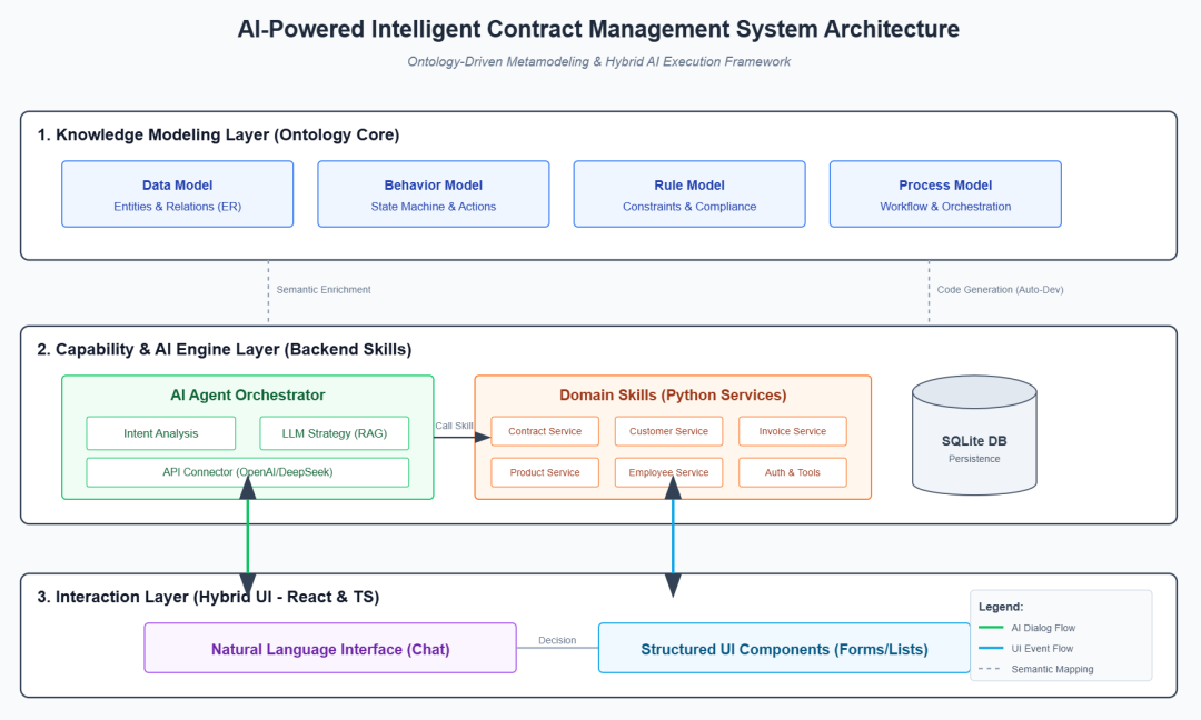 它摒弃了传统软件开发中“需求文档 -> 人工编码 -> 固化界面”的漫长流水线,实践了一套“本体抽象 -> 模型共识 -> AI生成底座 + AI动态运行”的新一代原生 AI 应用方法论。
