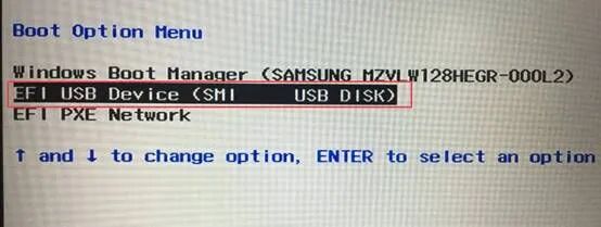 启动菜单出现后,选择"Boot Menu"(启动菜单),然后选择USB开头的选项,按回车键启动。