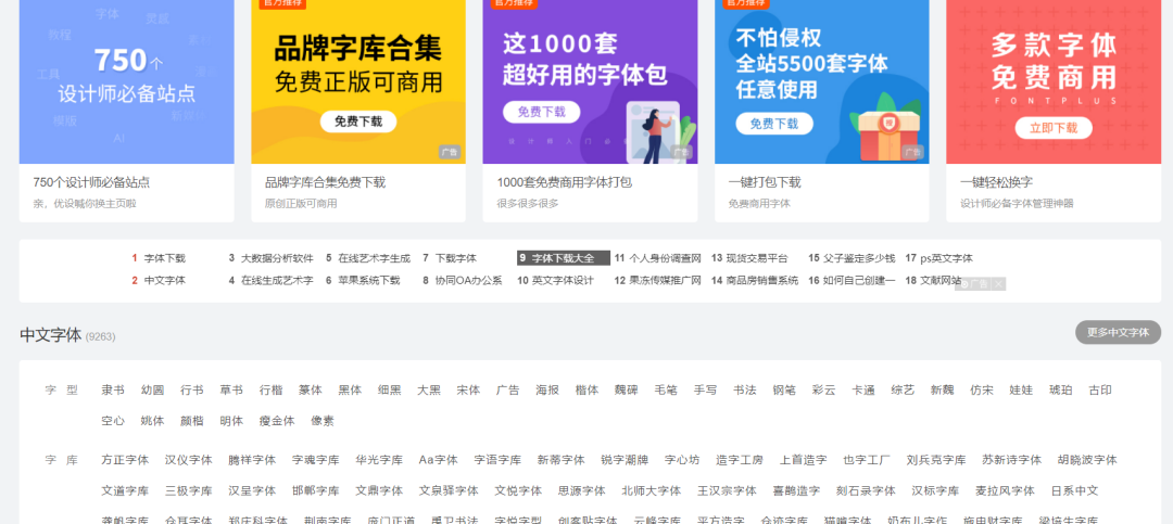 可以特别注意到【商用免费】这一栏目,点击进入后,将会发现所有字体均可免费用于商业用途,字体总数大约为240种,下载字体时每日是有数量限制的,建议采取分批下载的方式,每天下载几个字体。