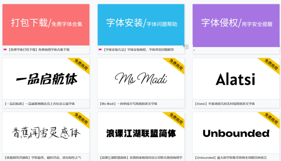 找字网是一个专注于字体分享的网站,汇集了众多知名字体,提供最新字体相关教程以及多样化的字体工具,可发现“免费下载”和“免费商用”两个专区,提供了字体使用指南和版权信息。