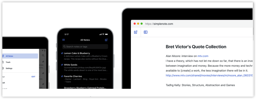 Simplenote是一款极致简约轻量的纯文本笔记软件,正如其名,它最大的特点就是简约,整个界面非常干净,清爽,你可以用它替代各个平台自带的备忘录——他们往往不能全平台同步。
