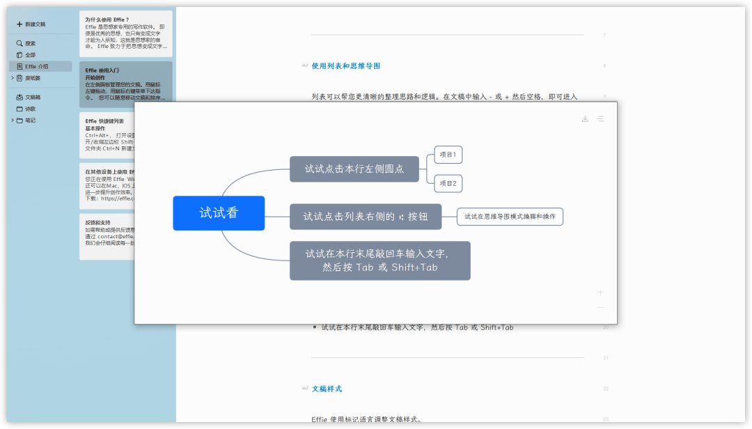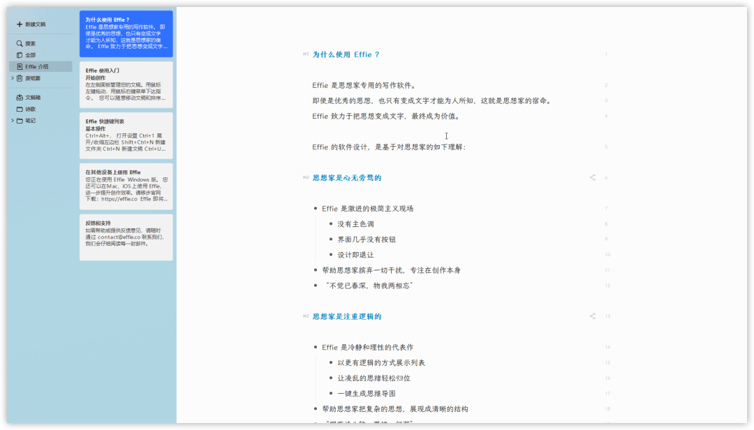 Effie 和 Standardnote 都是以简约为卖点的笔记软件,相较于 Standardnote,Effie 由于是商业软件,界面UI明显更加精致。也支持 markdown 语法、拥有macOS、Windows、iOS 等平台客户端,官方提供账号登陆以及免费数据云同步功能。
