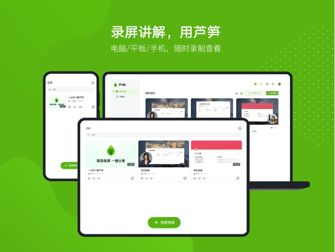 芦笋是一款极简的录屏分享工具,支持屏幕 +人像同时录制,可一键分享视频链接,对方不用下载和安装即可观看和评论。
