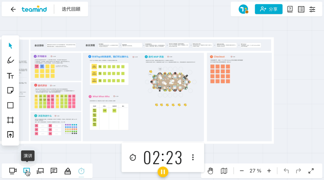 Teamind 是一款支持多人协作的在线白板,线上工作坊、多人讨论、头脑风暴、协同创作、敏捷开发等等都支持,尤其是近 2 年很多人开始居家办公,在线白板的使用频次也同步大增。