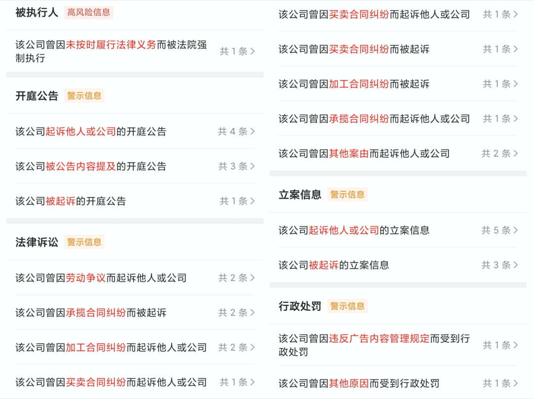 今年初有猎头向我推荐了某中小型公司的一岗位,印象中这家公司口碑挺一般的。于是在天眼查上专门搜了这家公司。好家伙,劳务合同纠纷、买卖合同纠纷、行政处罚一大堆,还被法院强制执行过。稍微看一下诉讼和处罚详情,就能发现这家公司在价值观和产品质量上实在是有够恶心的,还好发现的早。