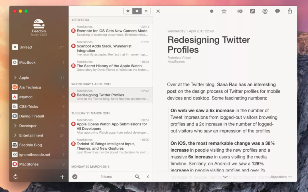 Reeder 是一款非常老牌经典的 rss 阅读器,既支持本地订阅 rss 源,可以同步其他阅读器。比如 Feedly、Inoreader、The Old Reader等等。