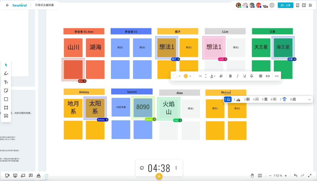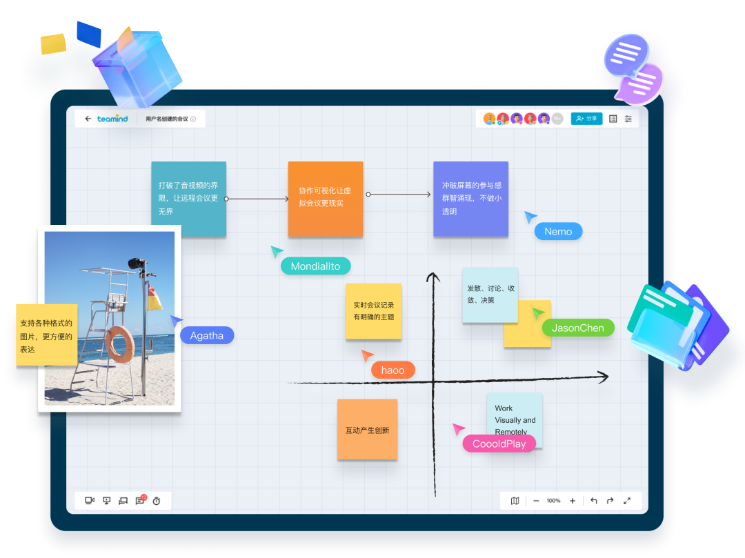 Teamind 就像一个「虚拟会议室」,在这个会议室里,内置一块可以无限延展的白板画布。在这块白板上,提供了便签/文本/图片/涂鸦等多样工具,团队成员无论身处何地,都可以即时加入白板,在线讨论。