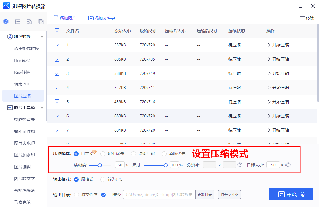 选择该功能后,上传图片,并根据自己的需求设置压缩模式、输出格式等,最后点击【开始压缩】就能批量压缩多张图片啦。
