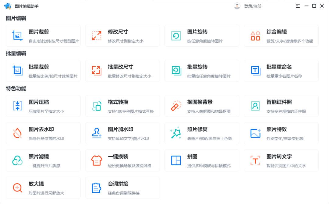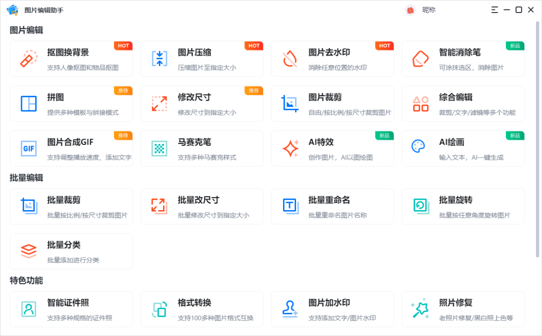 单看软件的名字就知道它与图片编辑有关~它的功能也是非常丰富的,分为图片编辑、批量编辑、特色功能三个大的功能点,其特色功能中就有我们今天需要用到的图片压缩功能。