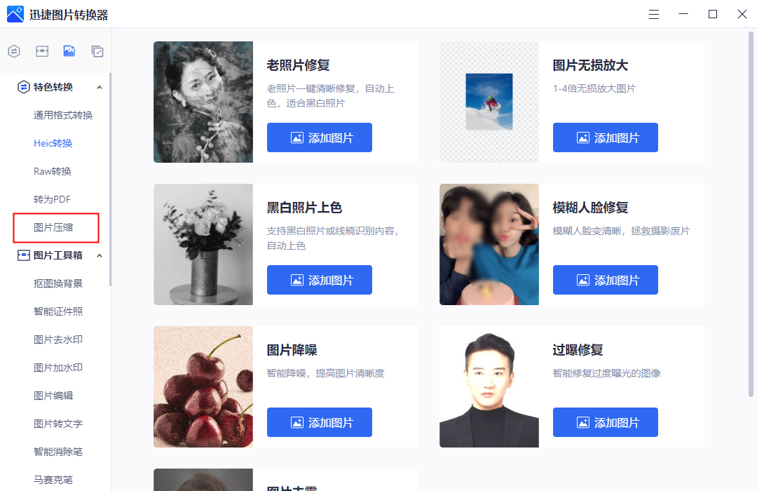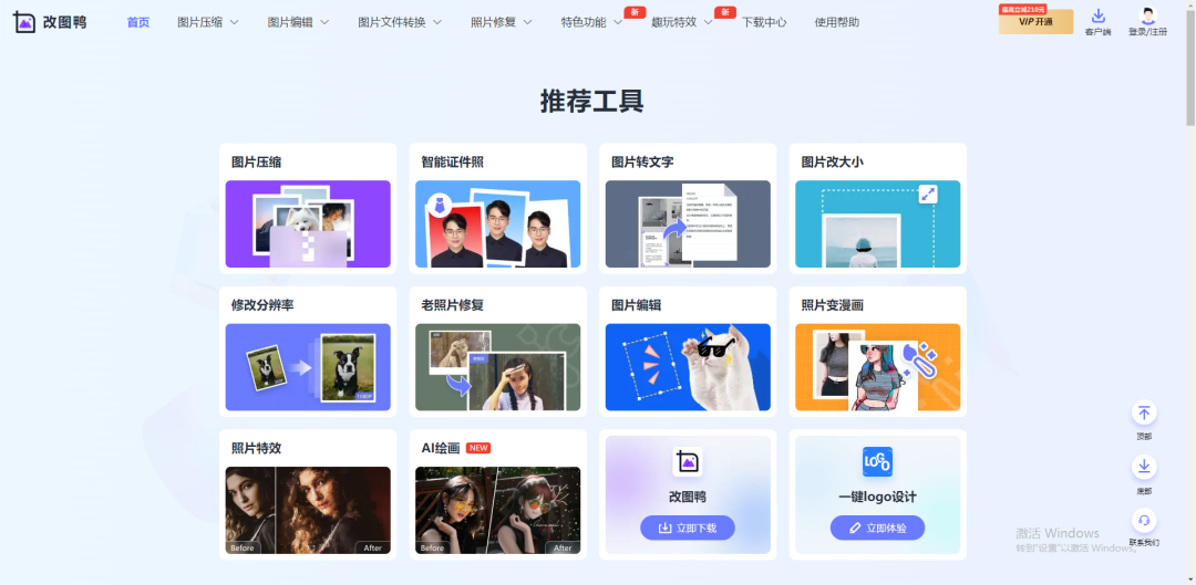 一个免费在线图片压缩网站,拥有几十种图片编辑功能,包括图片压缩、智能证件照、图片转文字、图片改大小、照片变漫画等功能都能找到,打开首页就能找到图片压缩功能