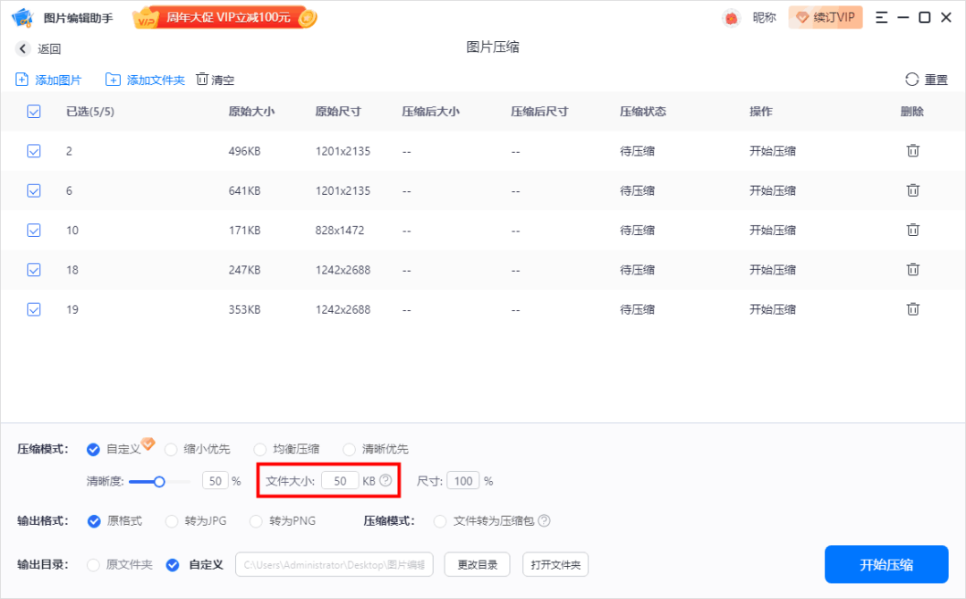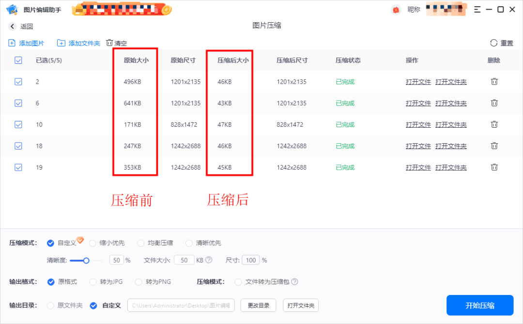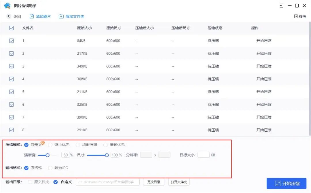 我们只需选择该功能,批量上传需要压缩的图片,选择自定义压缩,根据自己的需求,设置压缩数值,并对输出格式、输出目录信息设置,最后点击【开始压缩】就可以啦。