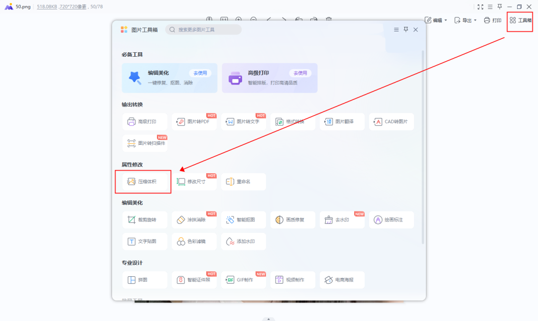 其压缩体积就可以帮我们对图片大小进行压缩,使用该软件打开需要压缩的图片,点击【工具箱】找到【压缩体积】功能,单击一下即可进入压缩界面。